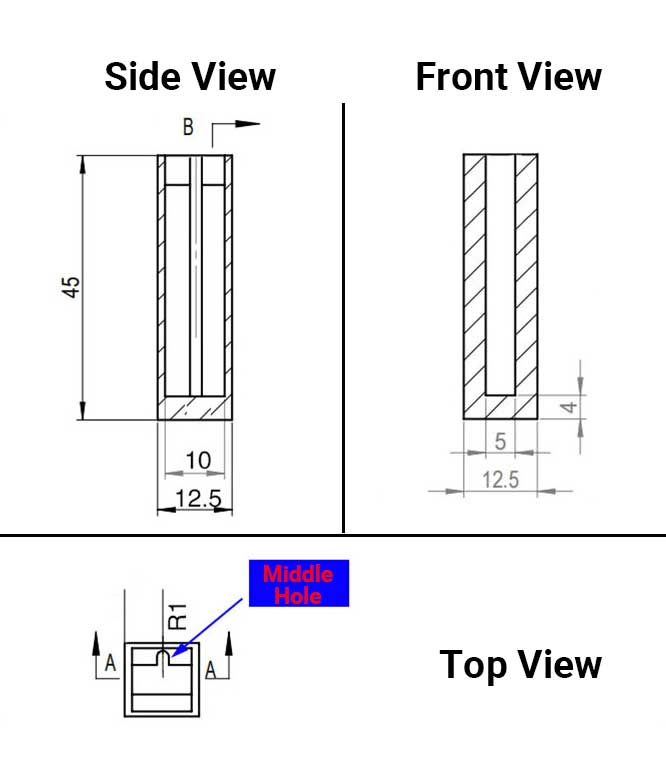 - Buitenafmeting (L×D×H): 12,5×12,5×45 mm